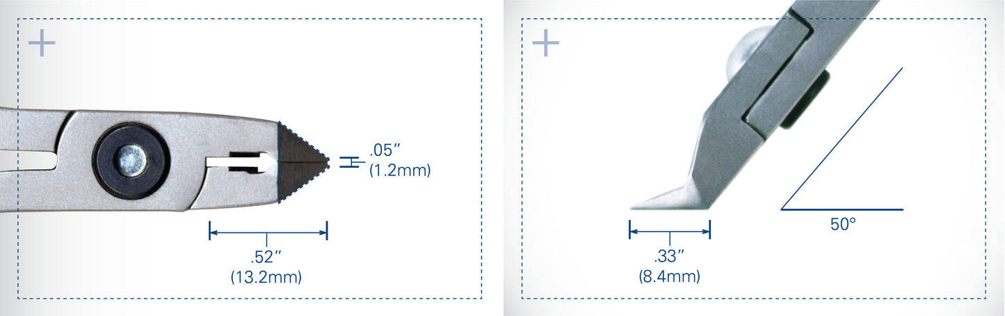 Tronex Angulated Large 50º Cutter has the largest cutting head. Robust. Excellent in cutting several leads in a single cut. Relieved for enhanced visibility. Flush cutting edges.